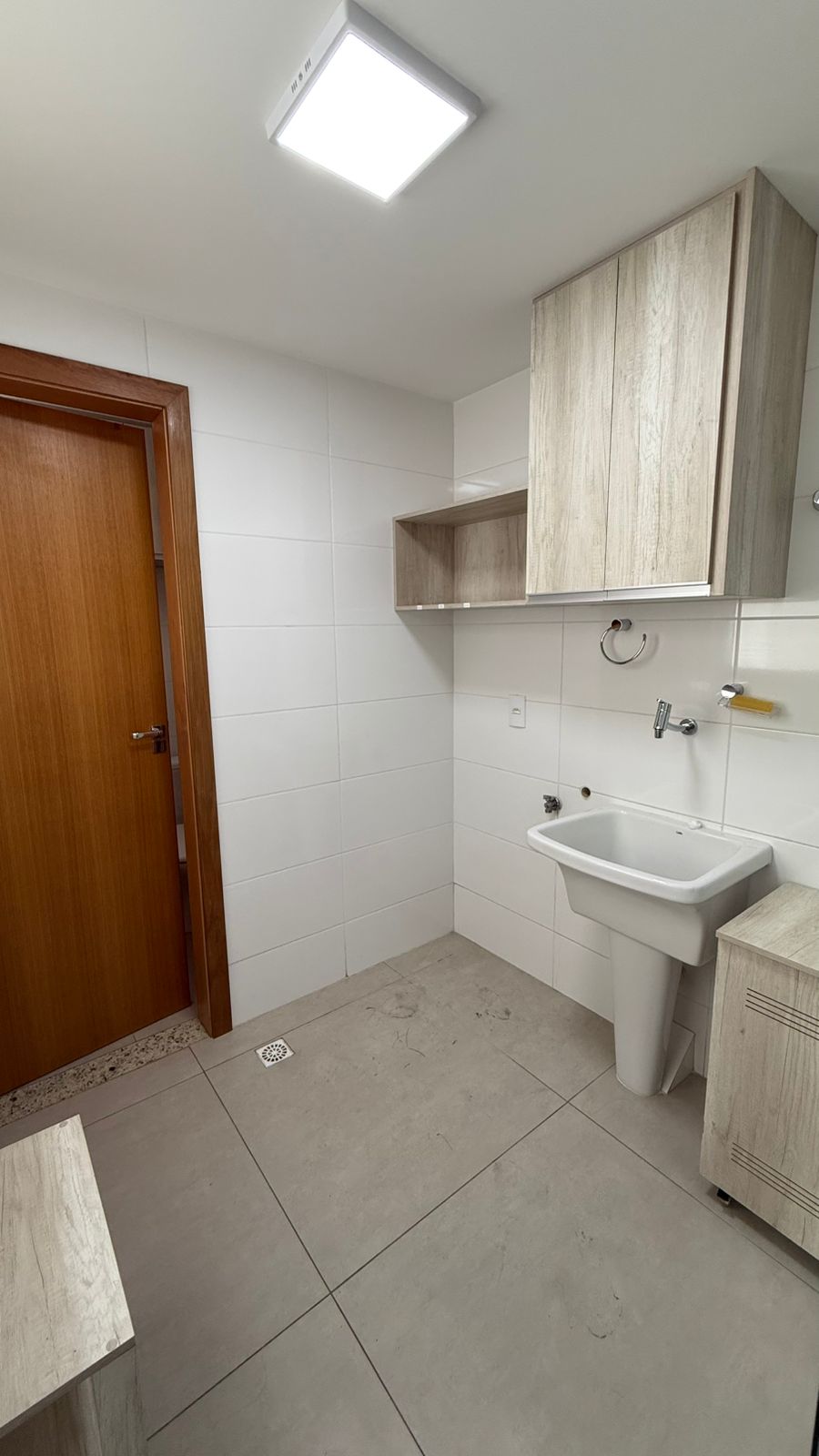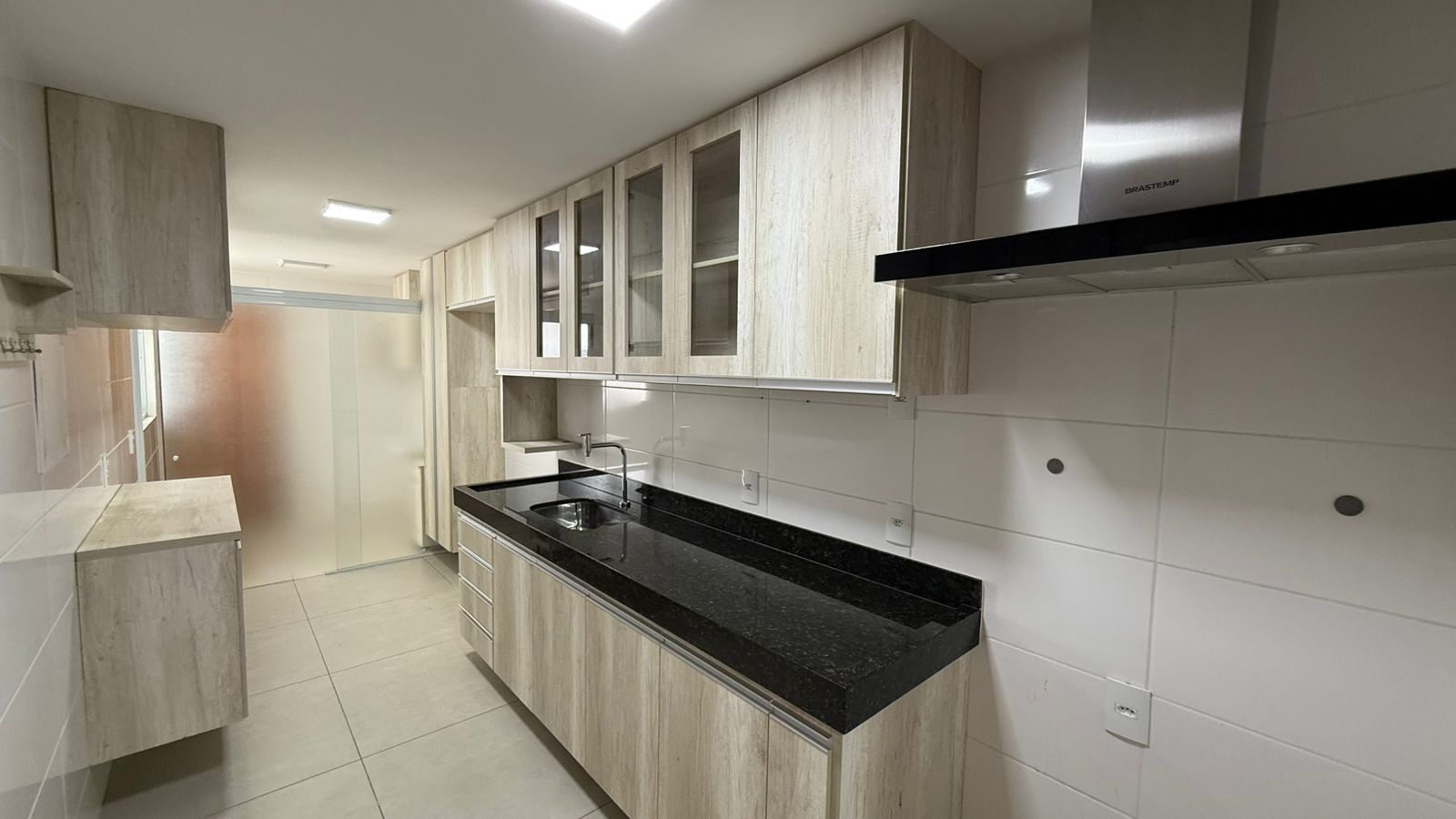 A cozinha, completamente equipada com armários planejados, coifa e acabamentos modernos, integra-se à lavandeira, que possui ainda uma divisão em vidro temperado e armários embutidos, além de banheiro de empregada.