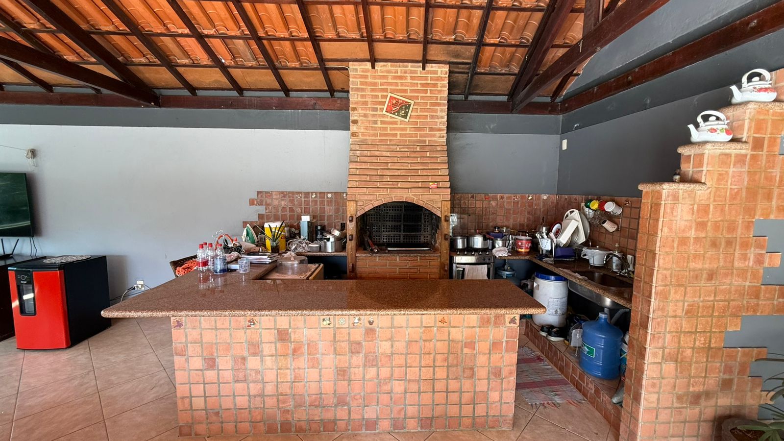• Área gourmet coberta, estruturada em madeira e telhado colonial, equipada com churrasqueira de alvenaria revestida em tijolinhos à vista e ampla bancada em granito em toda a extensão;